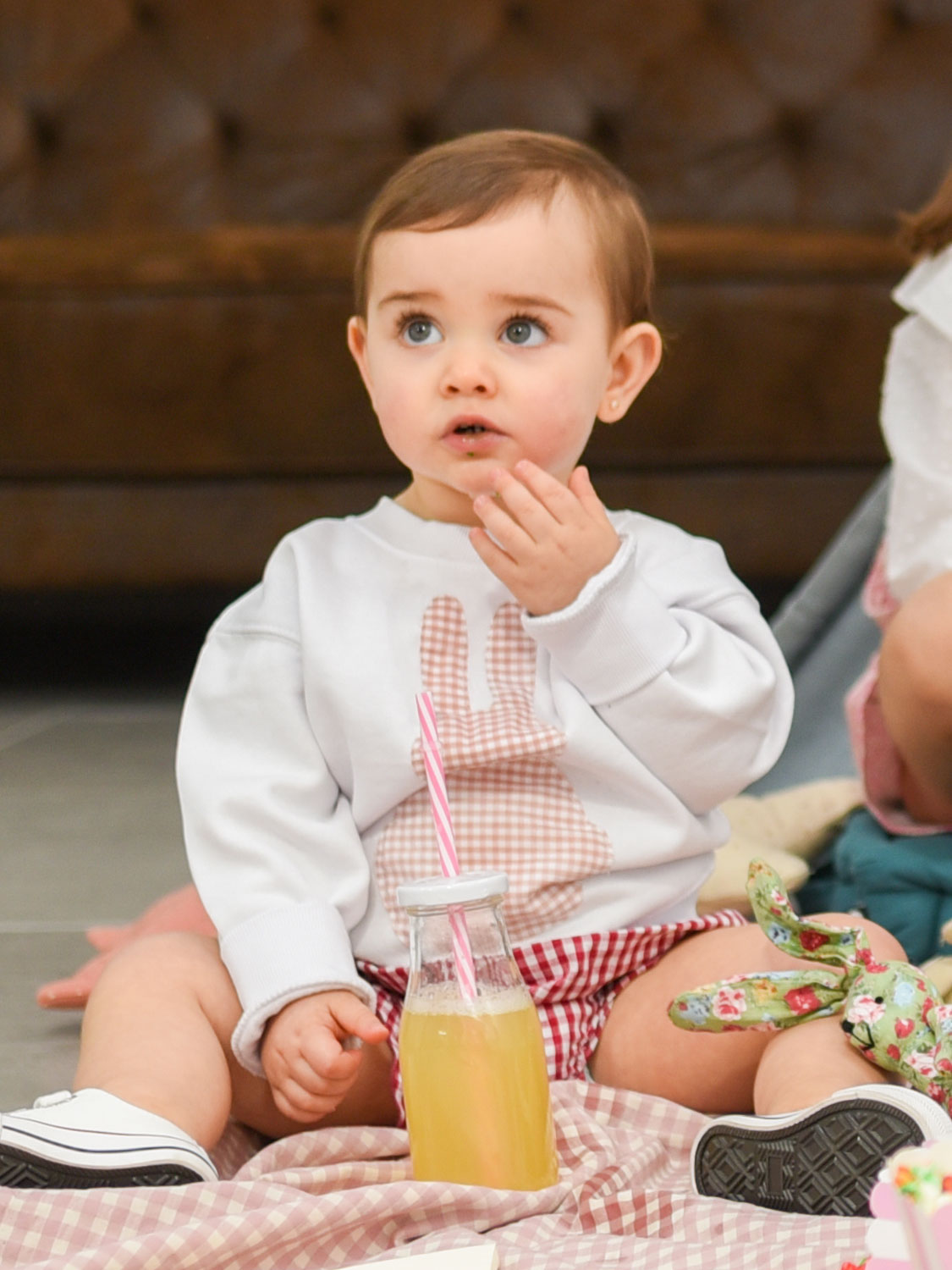 Sudadera en color blanco de algodón 100% orgánico con cuello redondo y elástico en puños y cintura. Sobre ella, bordado el Sr. Conejo en tela, imagen de My Martina Mini.